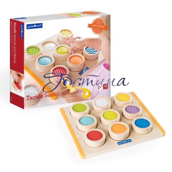 У цій грі цікаві малюки перевертають фактурні елементи головоломки, щоб визначити на дотик гладку поверхню, м'який плюш і інше. Дев'ять різних текстурних шайб з каучукового дерева відповідають різним матеріалам на дерев'яній підставці. Тренуйте навички сортування та зіставлення в цій захоплюючій тактильної грі на сенсорну пам'ять. Міцна дошка з ручками для перенесення.