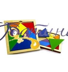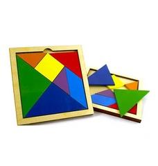 Являє собою квадрат поділений на 7 частин: 2 великих трикутника, 1 середній трикутник, 2 маленьких трикутника, квадрат і паралелограм. Виготовлено з деревени та пофарбовано в яскраві кольори. Розмір 22х22см