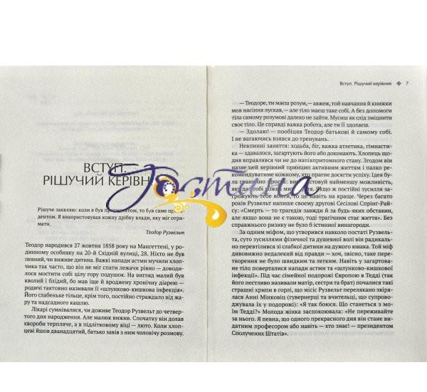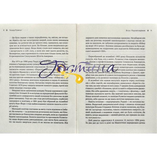 Теодор Рузвельт, за оцінками істориків, — один з найкращих президентів Сполучених Штатів, перший американець, який здобув Нобелівську премію миру. Що важчі були виклики — чи то в політиці, чи в особистому житті, — то палкіше Рузвельт кидався долати перепони.Досліджуючи його особисті пріоритети й здобуті досягнення, Алан Аксельрод пропонує новий погляд на життя видатного політика. Автор зосереджує увагу на 7 законах, що характеризують керівництво Рузвельта, і виокремлює 136 неоціненних правил, які допоможуть кожному, хто прагне успіху в бізнесі, реалізовувати власні амбіції й бути лідером.