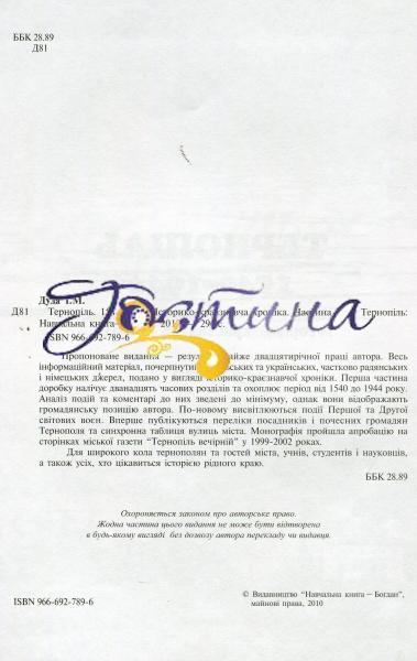 Пропоноване видання — результат майже двадцятирічної праці автора. Весь інформаційний матеріал, почерпнутий із польських та українських, частково радянських і німецьких джерел, подано у вигляді історико-краєзнавчої хроніки. Перша частина доробку налічує дванадцять часових розділів та охоплює період від 1540 до 1944 року. Аналіз подій та коментарі до них зведені до мінімуму, однак вони відображають громадянську позицію автора. По-новому висвітлюються події Першої та Другої світових воєн. Вперше публікуються переліки посадників і почесних громадян Тернополя та синхронна таблиця вулиць міста. Монографія пройшла апробацію на сторінках міської газети “Тернопіль вечірній” у 1999-2002 роках.