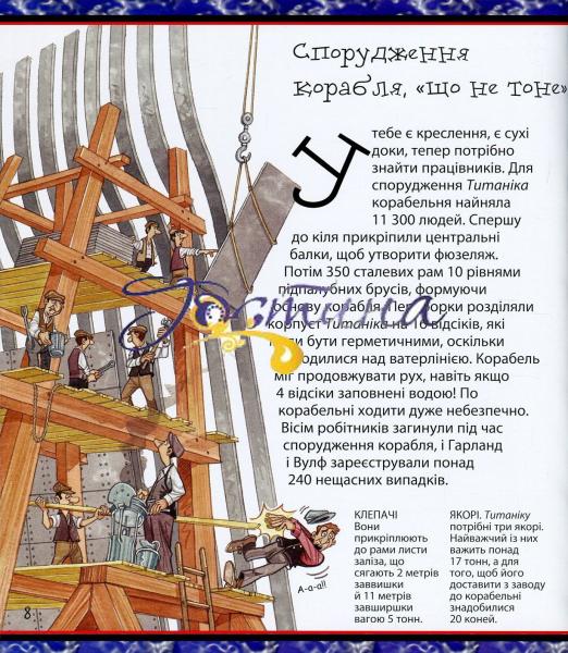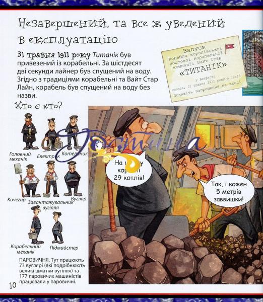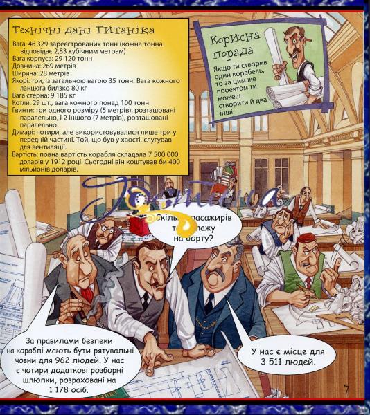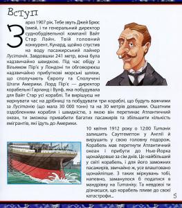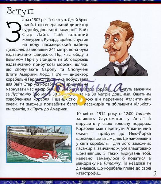 Із цієї енциклопедії ти довідаєшся про найбільший корабель в історії людства - 'Титанік'. Тут наведено дані щодо його розмірів, ваги, кількості осіб, задіяних на будівництві та обслуговуванні корабля, а також перелічено весь провіант і товари, які містилися в трюмах корабля, коли він вирушав у мандрівку Атлантичним океаном. Історія про загибель найбільшого в світі водного лайнера, у якій ти почуватимешся не пасажиром, а власником 'Титаніка'!