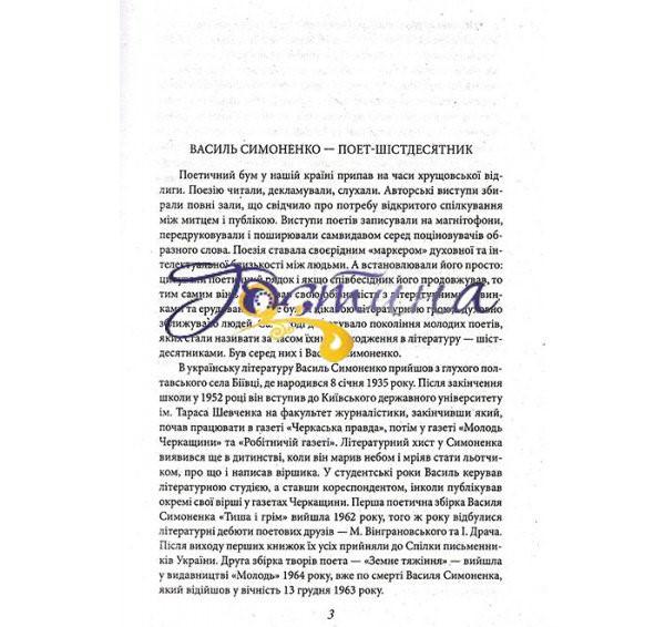 Василь Симоненко (1935–1963) – український поет-шістдесятник і журналіст – пішов із життя у неповних 28 років. Лише одна книжка була видана за життя поета. Але вже тоді набули великої популярності самовидавні поезії Симоненка, що поклали початок українському рухові опору 1960—1970-х pоків. Провідною темою його творчості є любов до України, її безталанного народу (i в цьому пряме продовження шевченкiвських традицiй). Тільки в незалежній Україні вiршi поета були надруковані у повному обсязі та без цензурних втручань. У 1995 році Василю Симоненку посмертно присуджено Державну премію України імені Т. Шевченка.