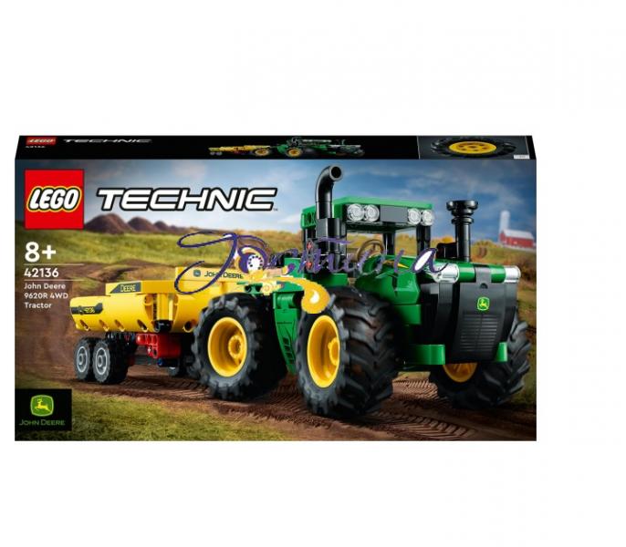John Deere 9620R 4WD Tractor LEGO® Technic™ (42136). Трактор із причепом, розроблений у співпраці з John Deere, відрізняється реалістичними функціями. У нього величезні колеса, шарнірне кермо і крісло, що повертається, в кабіні водія.