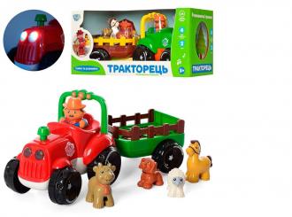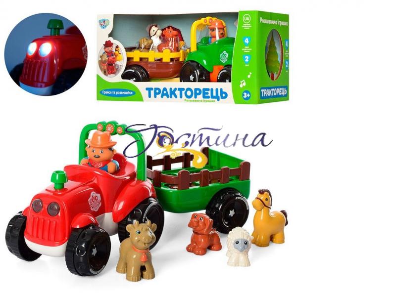 Трактор з причепом та тваринами, арт. M 5572 UA Якщо ви шукаєте незвичайну інтерактивну розвиваючу іграшку для свого малюка – неодмінно зверніть увагу на музичний Трактор з причепом та тваринами M 5572 UA від компанії Limo Toy. Цікава іграшка на коліщатках привертає увагу яскравістю та барвистістю. Чудовий трактор має водія-фермера та причіп, у якому зручно розташувалися конячка, собачка, овечка та корівка. На транспортному засобі є спеціальна кнопочка, що приводить його в рух і активує реалістичний звук двигуна та світло фар. Під час руху грає весела мелодія та звучить пісенька. Усі фігурки знімні і можуть використовуватись в окремих іграх. Коли ставиш їх на своє місце – трактор розповідає пізнавальний віршик про кожного. Фермер – сміється та співає пісеньку. Така іграшка не тільки розважає дитину приємною музикою, миготливими вогниками та забавними звуками, а й сприяє розвитку дрібної моторики, сприйняття, мислення, фантазії та уяви. Озвучено українською мовою. Довжина іграшки – 36 см. Працює від 3 батарейок типу ААА (у комплект не входять). В асортименті 2 кольори. Для дітей від 3 років.