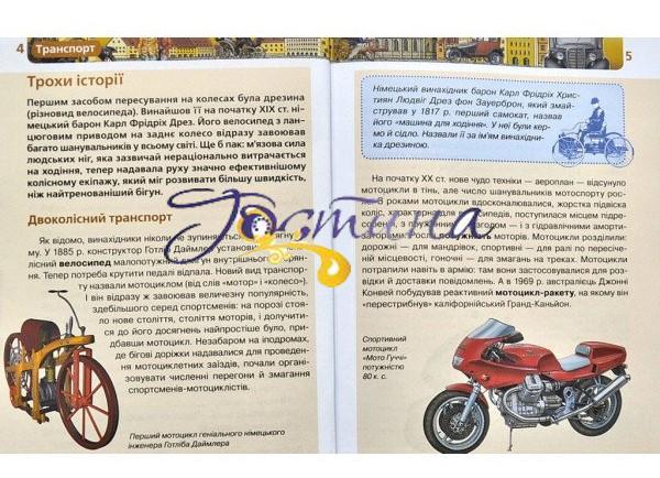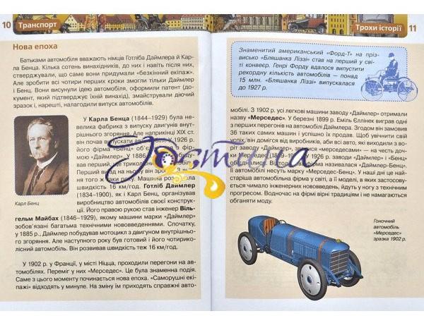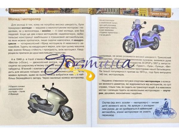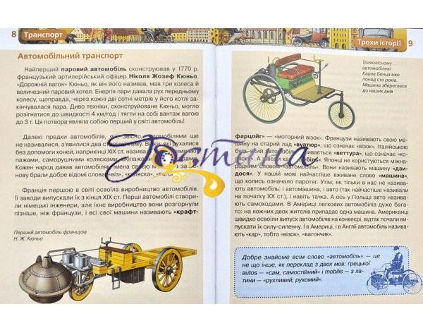 Пропонована книга знайомить юних читачів з найвагомішими подіями в історії транспорту — одного з найгеніальніших винаходів людства. У ній розповідається про найрізноманітніші машини: легкові, вантажні й будівельні, спортивні і гоночні, окремі розділи присвячені водному, повітряному й космічному транспорту, а також будові різних машин.