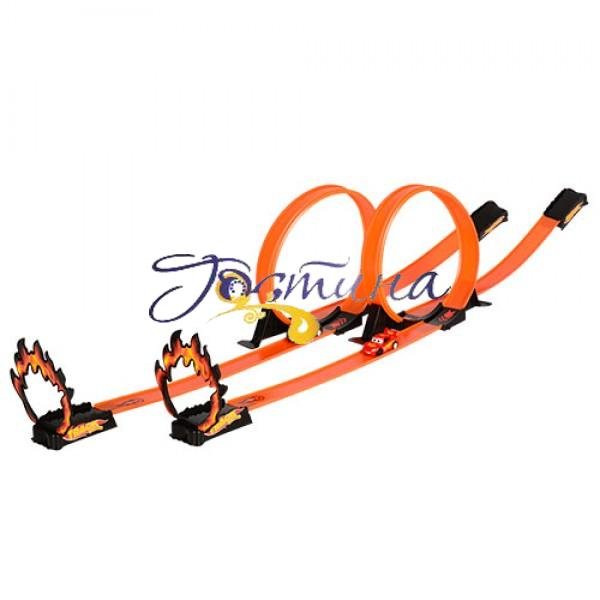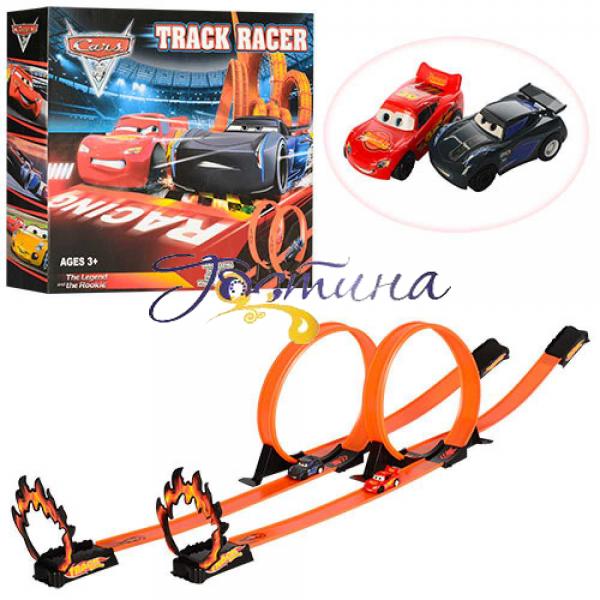 Шанувальники захоплюючого мультфільму напевно прийдуть в непідробний захват, отримавши в подарунок класний автотрек 8002! Трек складається з 2 трас, де є старт, мертва петля і фініш. На фініші машинки повинні пролетіти крізь імітацію палаючого кільця. У комплекті ти знайдеш: • 2 машинки - чорну і червону, які оснащені суперпотужним інерційним механізмом; • 2 листи з наклейками; • 2 довгих елемента траси; • 4 коротких елемента; • 2 трубна арматура для мертвих петель; • 2 вогненних кола; • 4 деталі для старту і фінішу.