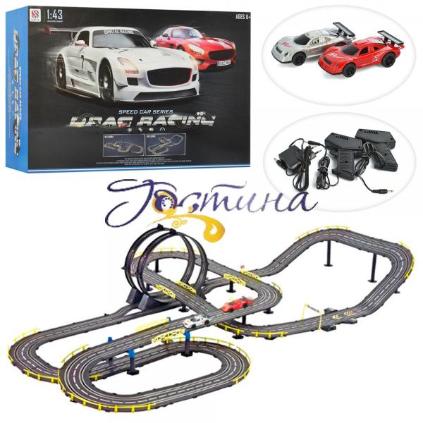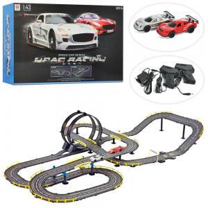 Трек 9905на радіоуправлінні, 1:43, 200-130см, машинка 2шт, 10см, світло, від мережі, в коробці. Розмір - 75-45-13см, Матеріал - пластмаса