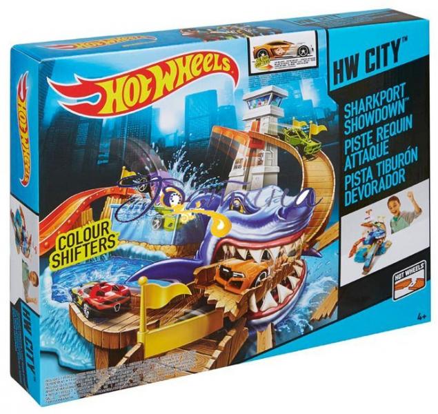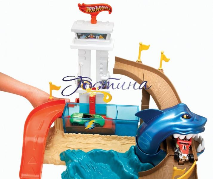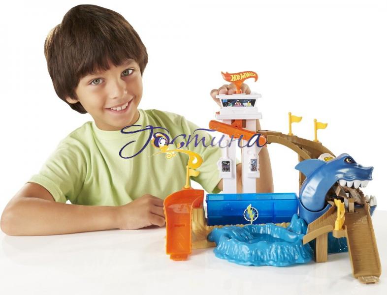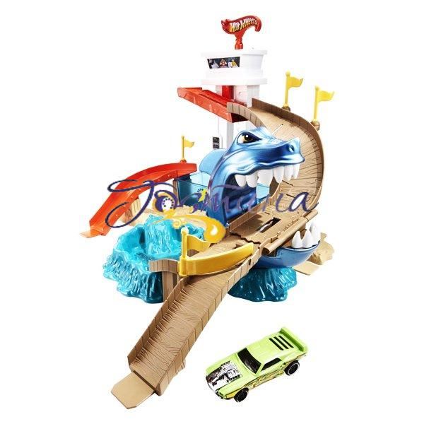 Круті віражі, небезпечні треки і неймовірні експерименти - ось, що чекає юного дослідника з набором Hot Wheels 'Полювання на акулу'! Він відноситься до серії треків 'Зміни колір', має в комплекті два контейнери для рідини і машинку, міняє колір, під впливом температури води, в яку вона занурюється. Це унікальна можливість пробудити дослідницький інтерес дитини, а також надати йому цікаве проведення часу на тривалий час. Але врахуйте, любителі екстриму, Вам належить бути обережними, адже на спуску з башти машинку Хот Вілс чекає підступна акула, яка готова в будь-який момент схопити авто своїми величезними щелепами. Набирайте максимальну швидкість - і станьте непереможними в сутичці з морським хижаком!