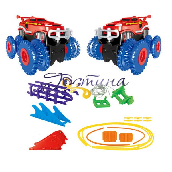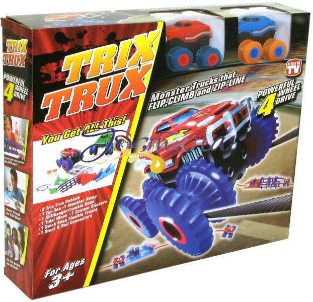 Трек 'Монстер-трек' (TRIX TRUX) на дві машинки BB883 (36шт) у кор. Trix Trux (Trie Trul) - нарешті всіма улюблені монстр-траки ожили і зійшли з екрану, перетворившись в дивовижний іграшковий гоночний канатний трек! На відміну від простих іграшкових машинок, монстр-траки Trix Trux їдуть по заздалегідь змодельованої вами трасі, долаючи різні перешкоди. Trix Trux (Трікс Тракс) можуть долати найскладніші траси завдяки великим колесам, а так само виконувати різні акробатичні трюки. Машинки Trix Trux (Trie Trul) настільки стійкі, що можуть їхати навіть на двох колесах, а якщо натягнути троси в повітрі, то монстр-трак із легкістю поїде по них Машинки Трікс Тракс - це абсолютно новий і унікальний підхід до перегонів: Можуть пересуватися по повітрі (для цього потрібно натягнути спеціальні троси). Можуть їздити на двох колесах. Роблять різні складні акробатичні трюки. Їздять догори ногами. З легкістю долають різні перешкоди. Можна самому моделювати трасу і управляти траєкторією руху.