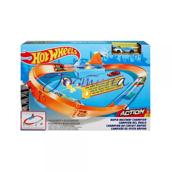Набір треків Rapid Raceway Champion - це класична перетяжка з приголомшливими стартовими воротами. Потягніть важіль вгору і відпустіть, щоб почати відлік часу. Все, що потрібно дітям, щоб отримати гонки прямо з пакету - помаранчева доріжка, що їдуть повороти, бігові гонки і пускові установки плюс один автомобіль Hot Wheel! Кожен набір підключається до інших наборів Hot Wheels (продається окремо) для чудового способу побудови епічної доріжки.