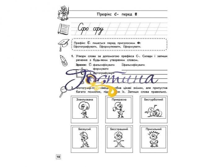На третій сторінці обкладинки дано короткий словник найбільш уживаних слів з орфограмме «Правопис приставок». Тренажер можна використовувати як на уроках, так і для самостійної роботи вдома.