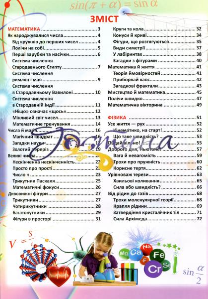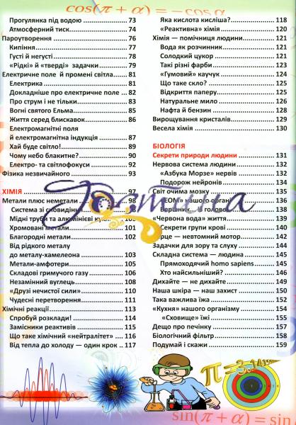 Усе, що створює людина, усе, чим вона живе, так чи інакше пов'язане з точними та природничими науками. Ця книжка допоможе хлопчикам і дівчаткам одержати нові знання з математики, фізики, хімії та біології людини. Яскраві ілюстрації, популярний виклад матеріалу, тематичні запитання, досліди, фокуси, вікторини — що ще треба для захопливого домашнього навчання?! Переконайтесь, що наука може бути надзвичайно цікавою! Адресовано допитливим хлопчикам і дівчаткам, а також їхнім дбайливим батькам.