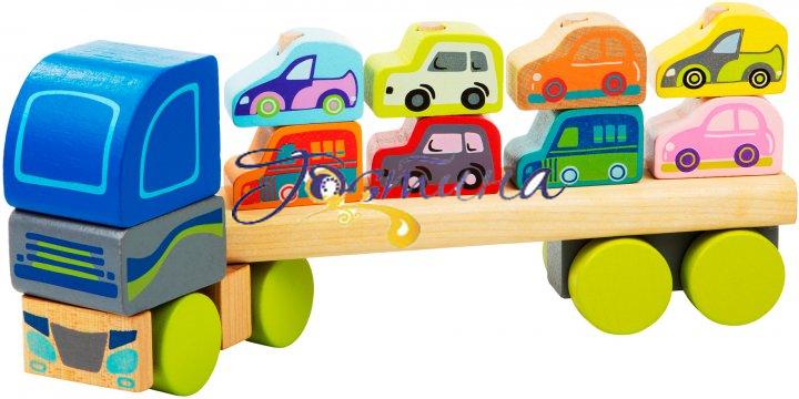 Тягач із машинками Левеня Cubika — це іграшка 2 в 1. По-перше, це маневрова вантажівка, у якого розбирається кабіна та відстібається причіп. По-друге, це 8 маленьких авто, які кріпляться на причепі за принципом пірамідки.