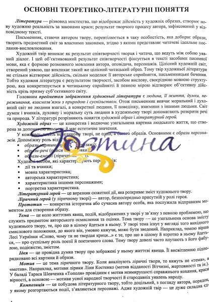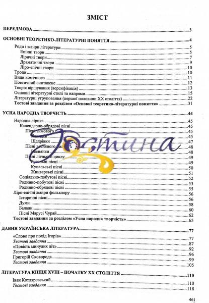 Посібник містить теоретичний матеріал, тестові завдання різних рівнів складності, тексти більшості програмових творів, демонстраційні варіанти тестів у форматі ЗНО, завдання та відповіді до сертифікаційної роботи з української літератури. Зміст матеріалів відповідає вимогам чинної Програми зовнішнього незалежного оцінювання з української літератури.