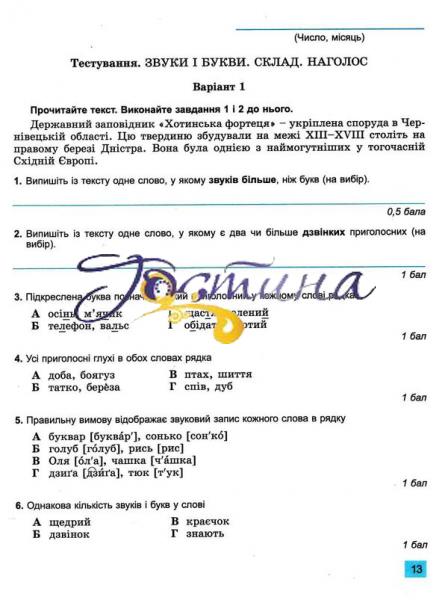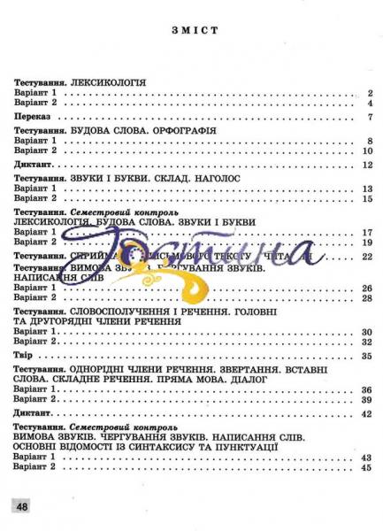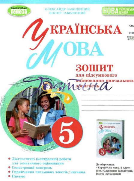 Посібник містить діагностичні (контрольні роботи), за допомогою яких можна оцінити навчальні досягнення учнів та учениць з української мови. Кожна робота для тематичного оцінювання та робота для семестрового контролю складається з 12 завдань різного виду і подана у двох варіантах. Біля завдань указано максимально можливу кількість балів за виконання. Для перевірки правописних навичок у зошиті передбачено місце для диктанту. Для оцінювання вміння логічно й зрозуміло викладати думки, доречно вживати слова, грамотно писати учням та ученицям пропонується написати переказ та твір. Крім оцінювання роботи за 12-бальною шкалою, учитель / учителька може висловити загальне враження від діяльності учнів / учениць. Для цього в кінці кожної роботи запропоновано словесні характеристики, біля яких учитель / учителька за бажанням поставить одну або кілька позначок.