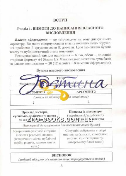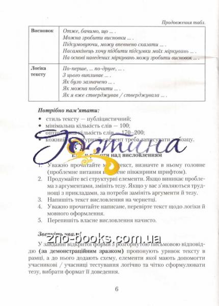 У цьому посібнику подано рекомендації щодо написання власного висловлення, критерії оцінювання цього виду роботи (розроблені Українським центром оцінювання якості освіти) і, на нашу думку, найцінніше — зразки завдань з розгорнутою відповіддю. Радимо не тільки вчителям, а й учням добре вивчити критерії оцінювання, адже, знаючи їх, легше створювати текст-роздум. Самі критерії чітко визначають необхідні складники власного висловлення, особливості їх оформлення. Приклади текстів-роздумів краще зорієнтують вас у тому, як формулювати тезу, докази й висновок, якими можуть бути ілюстрації з різних видів мистецтва (переважно з української і зарубіжної літератур), з історії або з власного життя. Частину тем і мікротекстів для написання власного висловлення взято з підготовлених УЦОЯО тестів зовнішнього незалежного оцінювання у 2009-2015 рр.