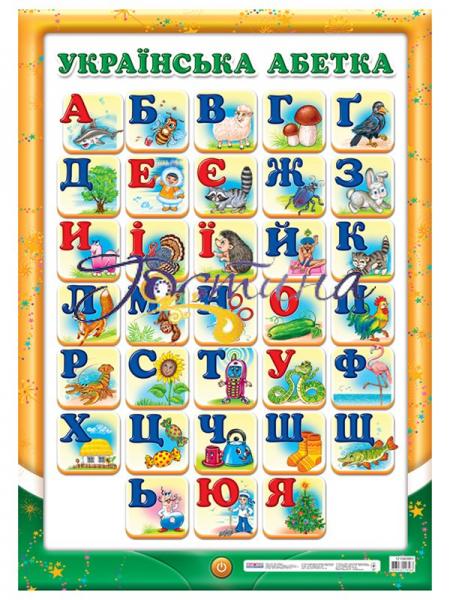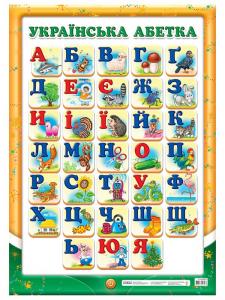 Українська абетка - демонстраційний і навчальний матеріал для занять вдома, в дитячих садах та групах підготовки до школи. Плакат містить 33 картки, на яких зображені букви і об'єкти, які відповідають до кожної букви українського алфавіту. - Розмір: 67,7x47,6x0,1 см.