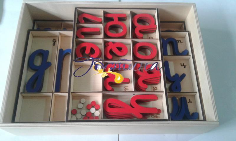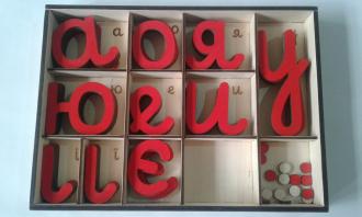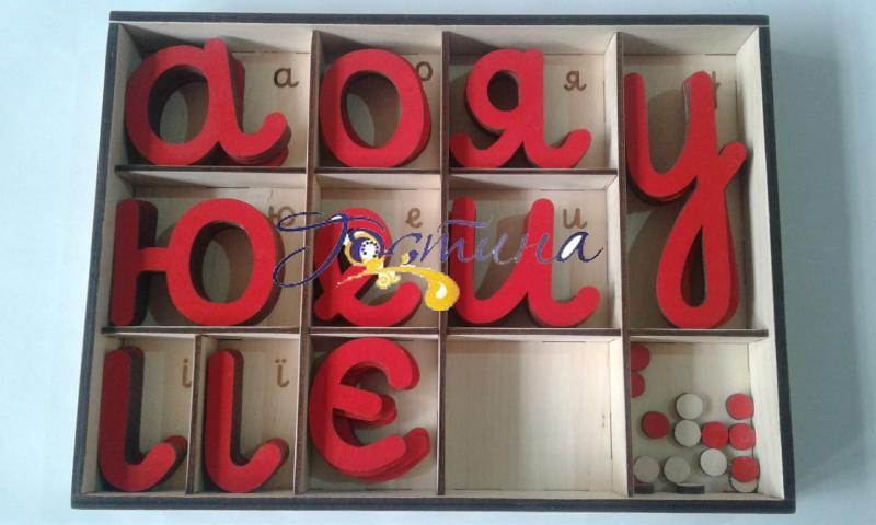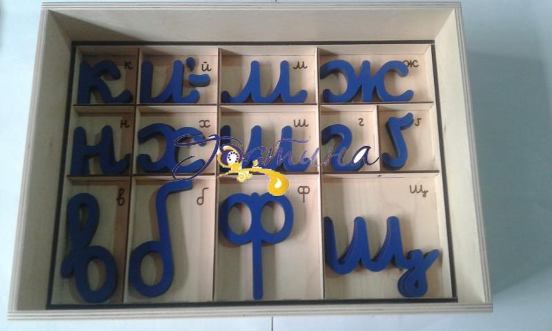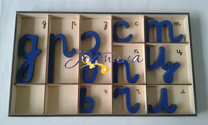Український алфавіт прописаний прямий. У комплект входить: згодних по 3 штуки, голосних по 5 штук, потрійна макетніца.