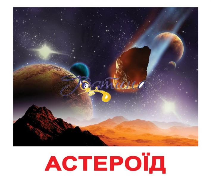 В набір увійшли:  1. Марс 2. Уран 3. Земля 4. Зірка 5. Комета 6. Місяць 7. Нептун 8. Сатурн 9. Юпітер 10. Венера 11. Астероїд 12. Меркурій 13. Супутник 14. Галактика 15. Космонавт 16. Затемнення 17. Обсерваторія 18. Сонячна система 19. Космічна станція 20. Космічний корабель  Перегляд яскравих картинок дозволяє дитині швидко засвоїти назви дерев, запам’ятати їх написання, розвиває у неї інтелект та формує фотографічну пам’ять.
