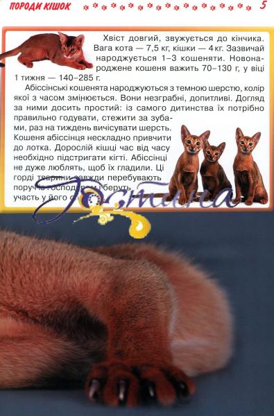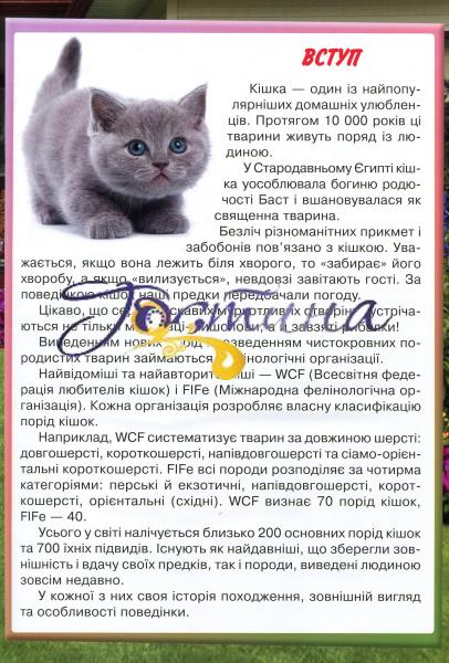 Перед вами енциклопедія порід котів, у якій ми спробували зібрати максимум корисної інформації. На сторінках видання ви знайдете відомості про анатомію й особливості поведінки домашніх улюбленців, дізнаєтеся про способи їхнього виховання та догляду. Тому, хто тільки планує завести вусатого вихованця, ця книжка допоможе зробити правильний вибір, а тим, у кого вдома вже живе маленьке пухнасте щастя, полегшить розуміння його психології та звичок. Яскраві ілюстрації допоможуть сформувати уявлення про кожну породу та її характерні риси.Книжку адресовано широкому читацькому загалу.