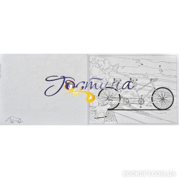 Літаючі колеса, кораблі, що пливуть кукурудзяними полями, корови, що ширяють у повітрі, і допитливий кіт у кожній сцені - пориньте в запаморочливий світ «Велосипедної розмальовки». Дослідіть фантастичні пейзажі, де проносяться різноманітні велосипеди без велосипедистів. Розмалюйте неймовірно детальні великі ілюстрації під час своєї подорожі і перегорніть сторінки ліворуч, щоб оживити пригоди кота. Міські та шосейні велосипеди, тандеми і триколісні велосипеди - усі вони вирушили в одну дивну подорож. Чи не поїдете і ви за ними…на край світу?
