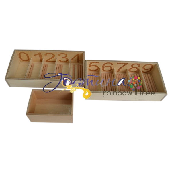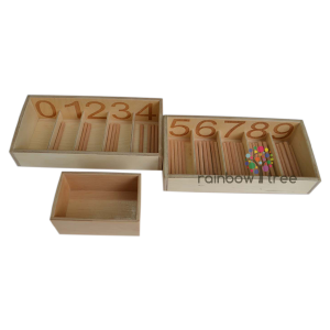 Опис матеріалу: Матеріал Веретена Монтессорі складається з двох фанерних ящиків з нанесеними на їх внутрішню частину цифрами, а також ящика з 45-ма рахунковими паличками (веретенами) для роботи.