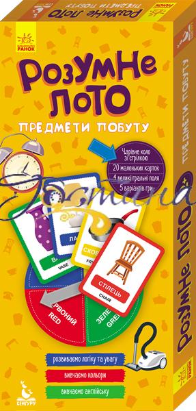 "Розумне лото" - гра, що допоможе: - вивчити окремі назви предметів українською та англійською; - навчитися розпізнавати кольори і форми; - розвинути увагу, спостережливість; - розвинути мовленнєві та комунікативні здібності; - провести дозвілля із задоволенням. Набір складається: 4 картки 350х100 мм, 20 карток 70х100 мм, коло зі стрілкою, картон. Коробка: 160х360 мм, гофрокартон, УФ лак.