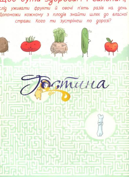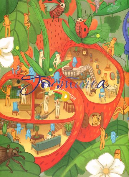 Овочі та фрукти — це здорово! Хіба ні? Щоб це зрозуміти малюк має познайомитися з їхніми мешканцями. Наприклад, пектин. Він цілими днями метушиться й прибирає організм. Магній завжди в гарному настрої. Вітамін B годинами просиджує над книгами. А ще є багато-багато інших. Всі вони дуже важливі для організму. Саме вони роблять яблука, помідори та броколі корисними! Книга великого формату містить в собі чудові докладні малюнки, які можна знову й знову роздивлятися з дитиною. В ній багато інформації, яка подана просто та з гумором. Завдяки кумедним героям малюк зрозуміє користь вітамінів. Після цієї книжки жодна дитина не залишиться байдужою до фруктів і овочів!