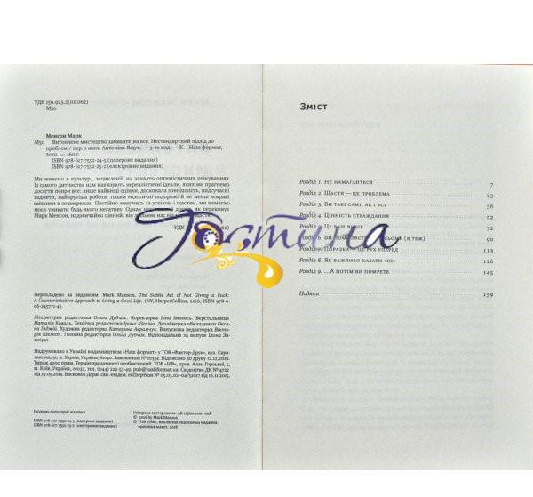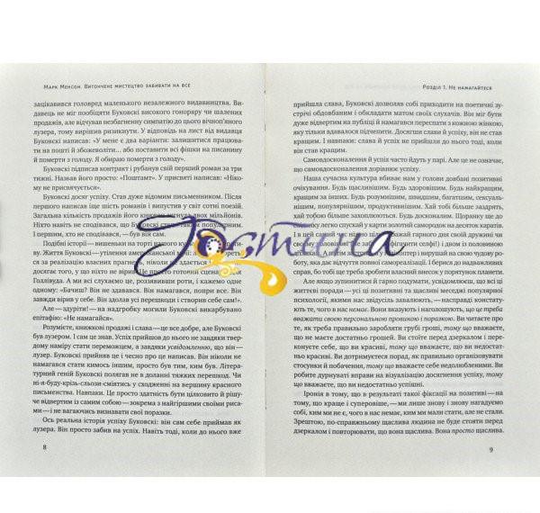 Ми живемо в культурі, зацикленій на занадто оптимістичних очікуваннях. Із самого дитинства нам нав’язують нереалістичні ідеали, яких ми прагнемо досягти попри все: лише найвищі оцінки, досконала зовнішність, надсучасні ґаджети, найкрутіша робота, тільки екзотичні подорожі й не менш яскраві світлини в соцмережах. Постійно женучись за успіхом і щастям, ми намагаємося уникати будь-якого негативу. Однак негативний досвід, як переконує Марк Менсон, надзвичайно цінний: він звільняє нас від міражу щастя.