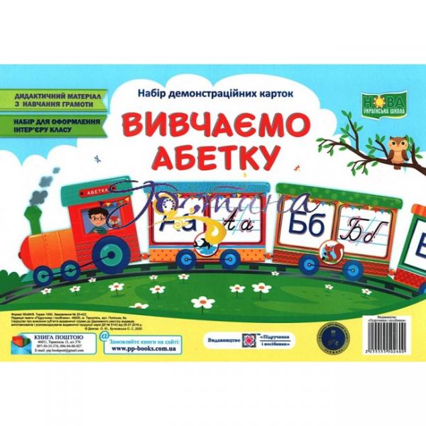Наочний комплект з навчання грамоти. Дидактичні матеріали містять набір із 34 демонстраційних карток для вивчення абетки з предмету навчання грамоти. Комплект містить макет поїзда, набір букв для оформлення інтер'єру класу. Використання комплекту допоможе урізноманітнити уроки математики, зробити їх цікавими й оригінальними відповідно до вимог Типових освітніх програм та Державного стандарту початкової освіти. Набір карток створено згідно програми "Нова Українська Школа" для вчителів початкових класів, вихователів груп продовженого дня, вихователів дитячих садків, студентів спеціальності «Початкове навчання».
