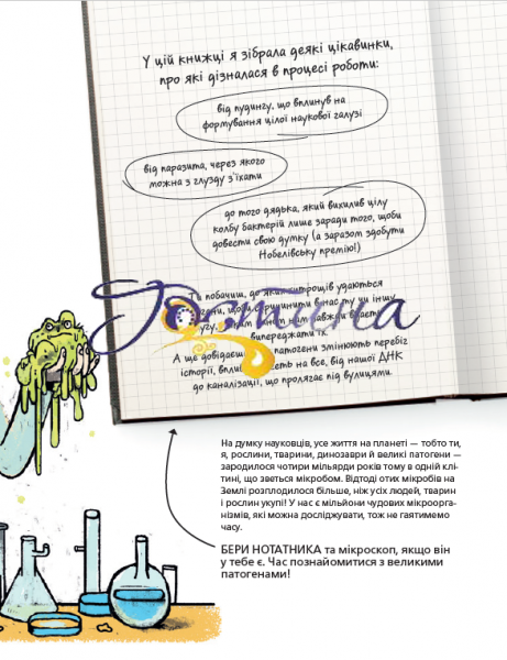 Що робити? Не панікувати! Книга «Воно заразне» стане твоїм провідником у химерному мікроскопічному світі патогенів — ти дізнаєшся, як вони живуть, зростають, змінюють людство і що ми робимо для того, аби зупинити їхнє поширення.