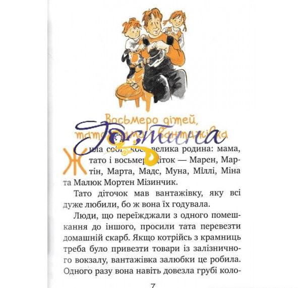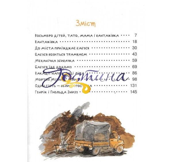 Книга «Восьмеро дітей, тато, мама і вантажівка» про напрочуд дружну і міцну родину. Її складають тато з мамою, восьмеро доньок та синів, вантажівка, бабуся і згодом пес-знайда на ім’я Димар. Навіть найменші члени дещо ідеалізованої родини завжди усвідомлюють, що дім і близькі – найважливіші, а здолати чи, швидше, не звертати уваги на злидні й насмішки їм допоможе єдність. Вони мають одне одного і декількох найліпших друзів для компанії – більше нікого й нічого ця самодостатня родина, чиє прізвище читачам навіть не відоме, не потребує.