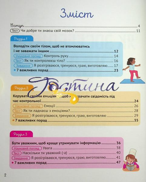 Ця книжка допоможе дитині домагатися успіху, зосереджуватися на досягненні мети, контролювати тіло й емоції, а також ліпше запам’ятовувати нову інформацію. Уважність, наполегливість і вміння самоорганізовуватися стануть у пригоді під час навчання.