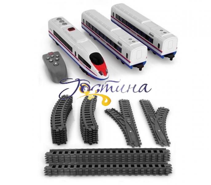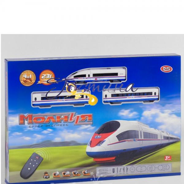 Набір Блискавка 9713-1А – це залізниця радіокерування виробництва фірми Play Smart для дітей віком від 3-х років. Дорога Блискавка 9713-1A є сучасною залізницею з поїздом Експрес. Вона складається з локомотива та двох пасажирських вагонів, які рухаються рейками (12 елементів дороги збираються в коло діаметром понад 100 см).