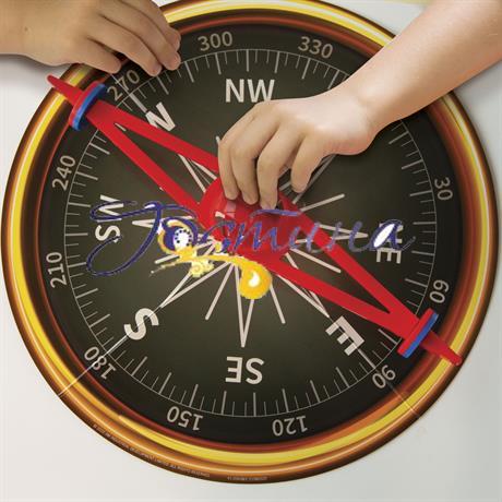 Зберіть гігантський компас за схемами в інструкції та приступайте до його тестування. Переконайтеся, що поблизу немає металевих предметів і сильного вітру. Злегка натисніть на стрілку компаса. Вона обертається і зупиняється червоним кінцем магніту на північ. Поверніть круглий шаблон так, щоб буква N опинилася під червоним кінцем магніту.