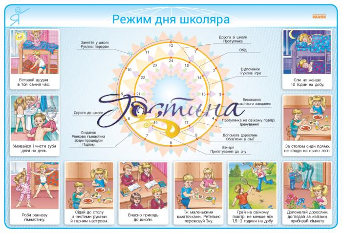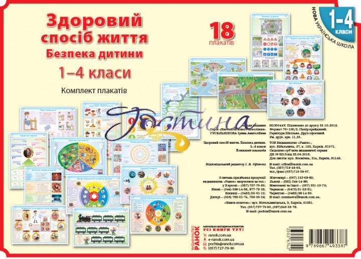 9 двосторонніх плакатів: Пиши правильно!; Режим дня школяра; Здоров'я людини; Безпечний відпочинок протягом року; Корисна і смачна їжа - джерело енергії і здоров'я організму; Здорове харчування; Дорожня азбука; Регулювання дорожнього руху; Мої зобов'язання; Закони дружби; Умови правильного розвитку дитини; Характер людини; Формування особистості; Безпека на дорозі; Людина і суспільство. сім'я; Безпечна поведінка вдома