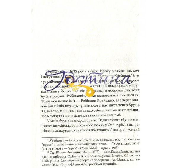 “Робінзон Крузо” — відомий роман класика англійської літератури Даніеля Дефо (1660—1731), що продавався тисячними накладами ще за життя автора. Твір був написаний на основі реальних подій: моряка Александра Селкірка внаслідок конфлікту з капітаном залишили з мінімальним припасом на безлюдному острові, де він провів чотири роки. Тонкощі взаємодії з природою, Богом, глибше пізнання себе, власних істинних потреб — усе це майстерно вплетено в захопливу розповідь про пригоди людини, що з комфортних умов цивілізації потрапилав непривітну “зелену пустелю” без найнеобхідніших предметів і знарядь праці. Герой наново визначає для себе цінність багатьох речей, і деякі його висновки можуть здатися нашим сучасникам дещо несподіваними.