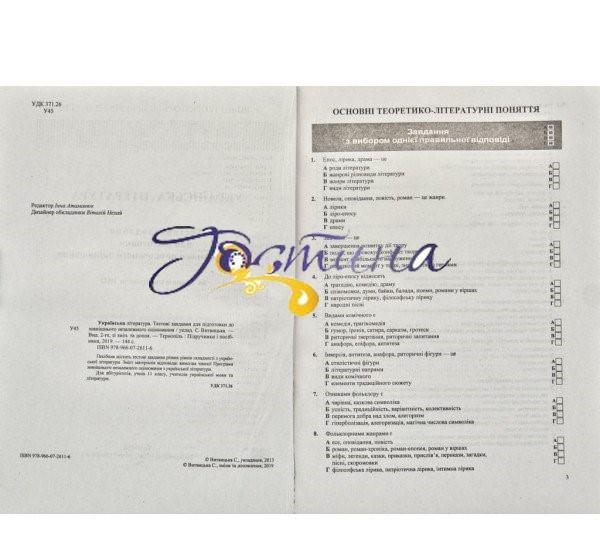 Посібник містить тестові завдання різних рівнів складності з української літератури. Зміст матеріалів відповідає вимогам чинної Програми зовнішнього незалежного оцінювання та чинних навчальних програм з української літератури.