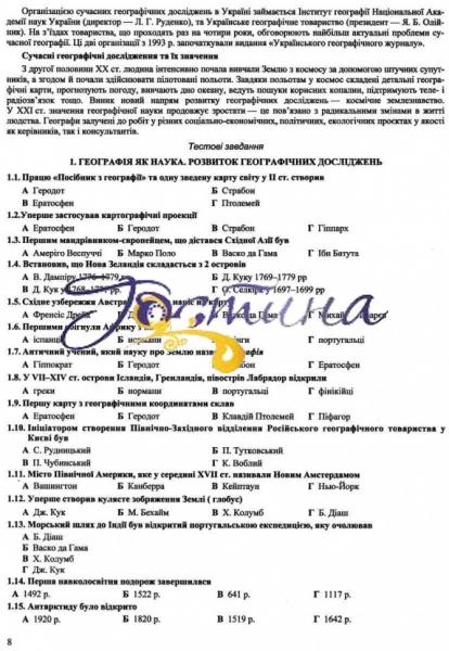 Посібник містить теоретичний матеріал, а також тестові завдання різного ступеня складності. Зміст матеріалів відповідає вимогам чинної програми зовнішнього незалежного оцінювання та чинних навчальних програм з географії. Для абітурієнтів, учнів 11 класу, вчителів географії.
