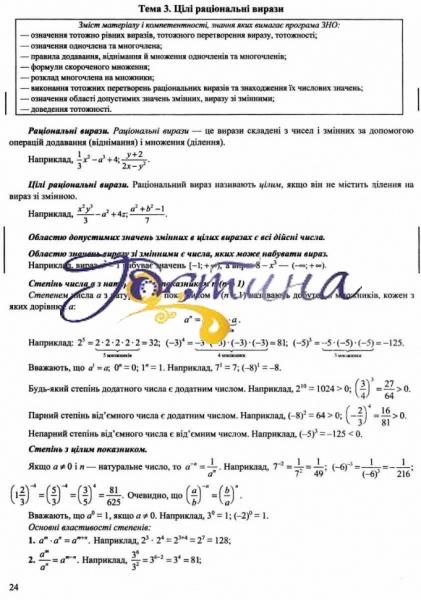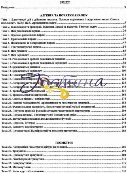 Посібник призначений для підготовки здобувачів повної загальної середньої освіти й абітурієнтів до ДПА та ЗНО. Його укладено відповідно до вимог Програми ЗНО, затвердженої Міністерством освіти і науки України, та чинних підручників з математики.