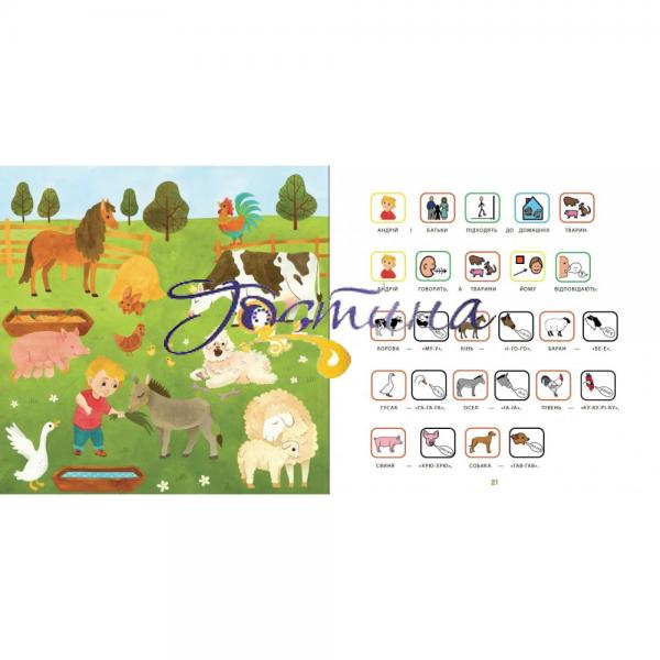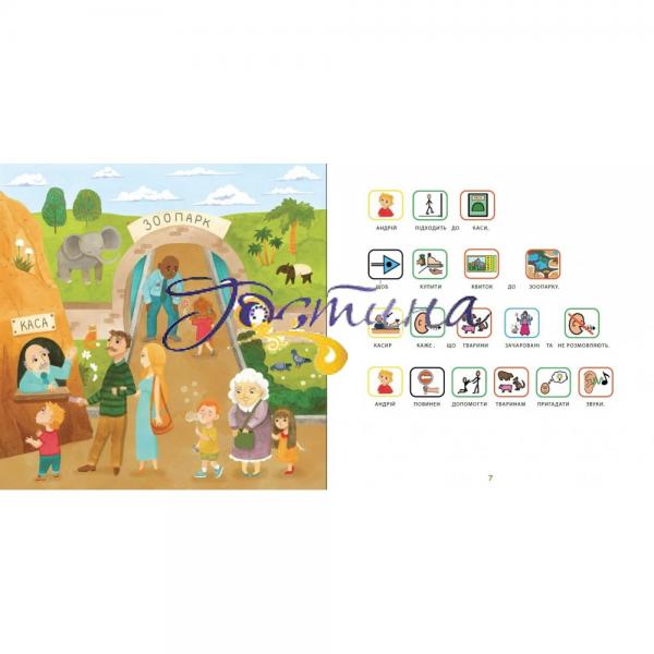 «Зоопарк» - це книга, яка розповідає про правила поведінки в різних громадських місцях - в зоопарку, кафе, на дитячому майданчику, а також допомагає навчитися правильній вимові звуків, розвиває мову і навички спілкування. Адаптований текст робить читання доступним для дітей, що мають труднощі з вивченням букв або розумінням тексту.